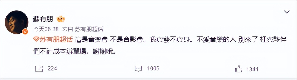 对此,苏有朋发文:“这是音乐会,不是合影会。我卖艺不卖身。不爱音乐的人别来了,枉费伙伴们不计成本办单场。谢谢哦。”